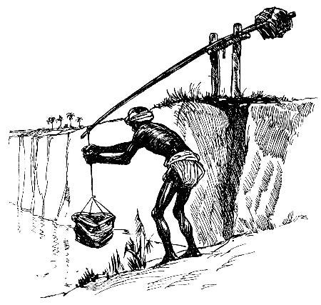 Then one day, a stranger arrives with a wooden pole on a pivot, a stone lashed to one end, a bucket on the other. A shaduf. Pull the long end down, and the bucket dips into the canal. Release, and the counterweight lifts the water. A child could work it.